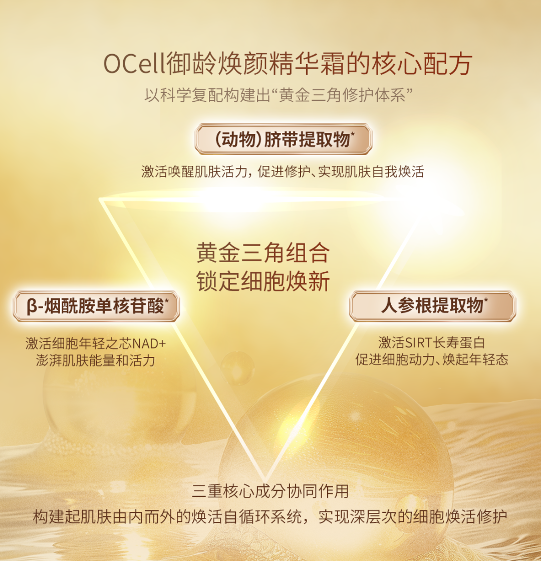 OCell御龄焕颜精华霜的核心配方,以科学复配构建出“黄金三角修护体系”:
