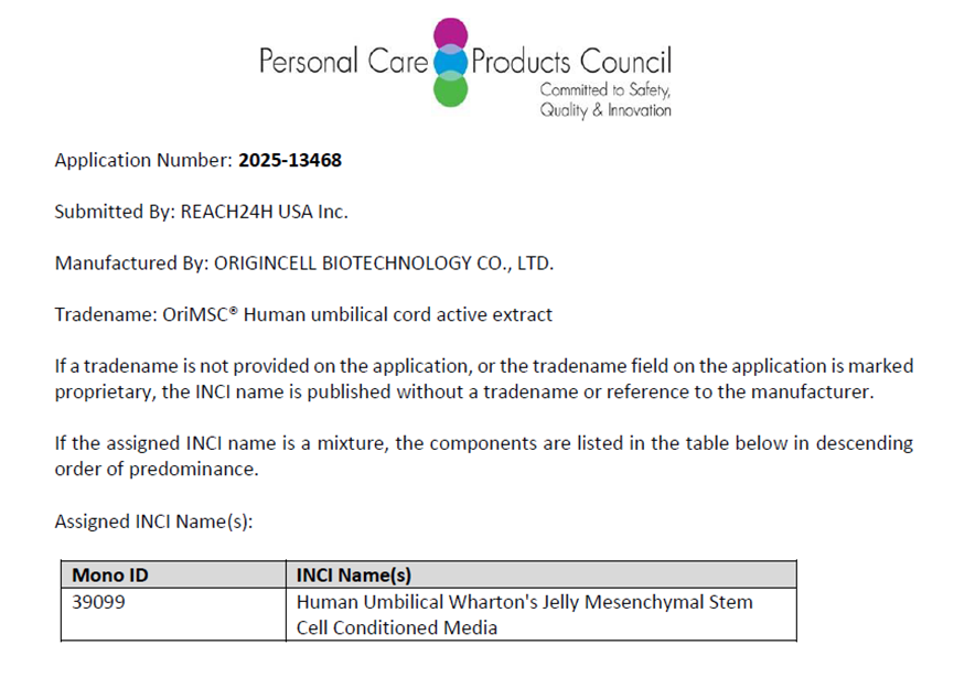 国际化妆品原料命名委员会(International Cosmetic Ingredient Nomenclature Committee)最新公示显示,开能健康科技集团股份有限公司旗下上海原天生物科技有限公司自主研发的两项核心原料——OriMSC™人脐带活性提取物与OriExo®️人脐带间充质干细胞外泌体,已顺利通过国际化妆品原料(International Nomenclature of Cosmetic Ingredients,INCI)备案,并被正式纳入全球化妆品原料名录。