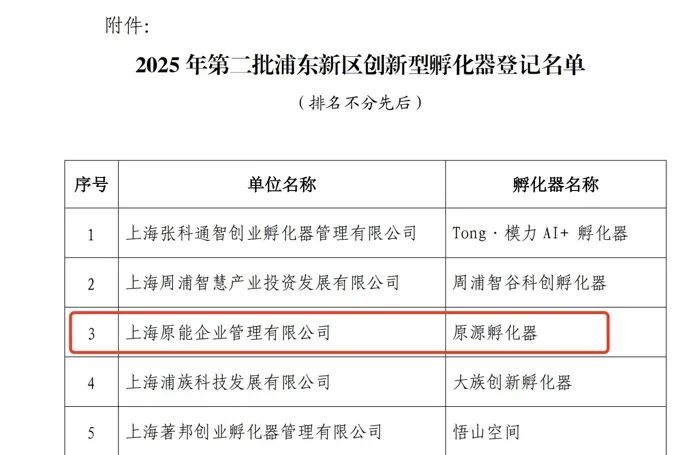 近日,上海市浦东新区科技和经济委员会正式公布2025年第二批浦东新区创新型孵化器登记名单。由原能集团旗下上海原能企业管理有限公司运营的“原源孵化器”顺利通过审核并完成公示,正式获批成为浦东新区创新型孵化器。